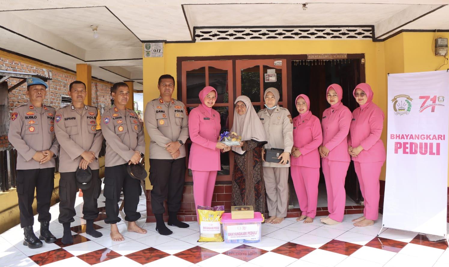 Ketua Bhayangkari Cabang Mura, Ny Anggitta Danu didampingi Kapolres Mura, AKBP Danu Agus Purnomo SIK, MH, melaksanakan Bakti Sosial (Baksos), kerumah warakawuri dan purnawirawan Polri di Kelurahan Pasar B Srikaton, Kecamatan Tugumulyo, Kabupaten Mura, Jumat (25/8/2023).
