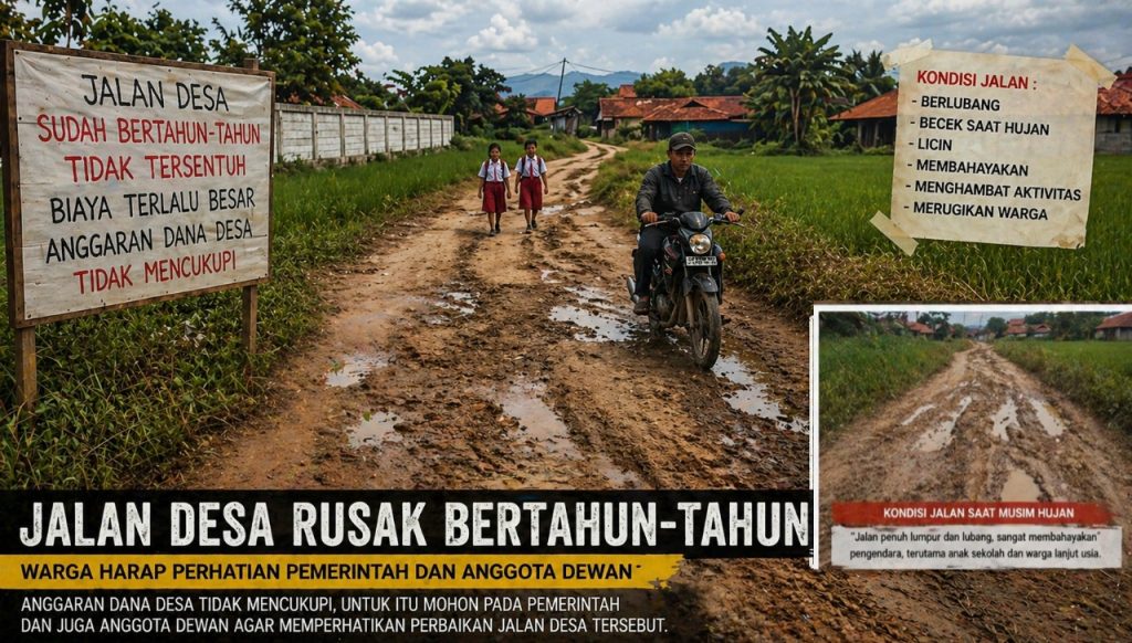 Purwakarta – Kondisi memprihatinkan kembali terlihat pada infrastruktur jalan desa di wilayah Kampung Tegal Kelapa, RT 12 RW 04, Desa Citeko, Kecamatan Plered. Jalan desa sepanjang kurang lebih 1.000 meter dengan lebar sekitar 2,5 meter yang menghubungkan Desa Citeko dengan Desa Rawasari itu dilaporkan telah mengalami kerusakan berat selama bertahun-tahun tanpa adanya perbaikan yang signifikan dari pihak terkait.