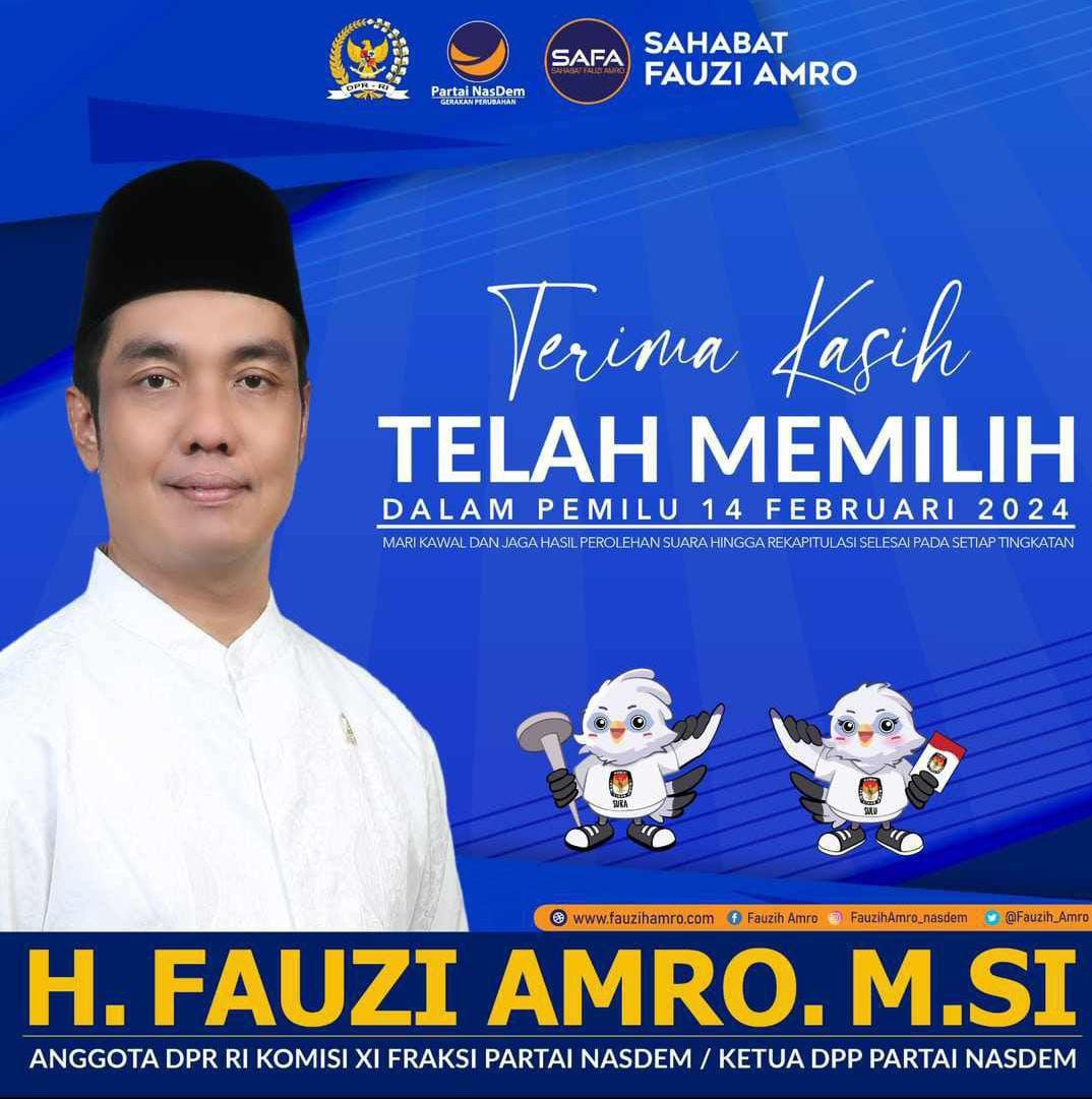 “Terima kasih atas do’a dan dukungannya untuk Partai NasDem dan kakak Fauzi H. Amro. Sesuai Perolehan Suara Caleg DPR RI DAPIL Sumatera Selatan 1 dan berdasarkan Hasil Rapat Pleno KPUD SUMSEL 10 Maret 2024, kakak Fauzi H. Amro bisa kembali melanjutkan pengabdian lewat jalur legislatif,” katanya, Sabtu (16-03-2024)