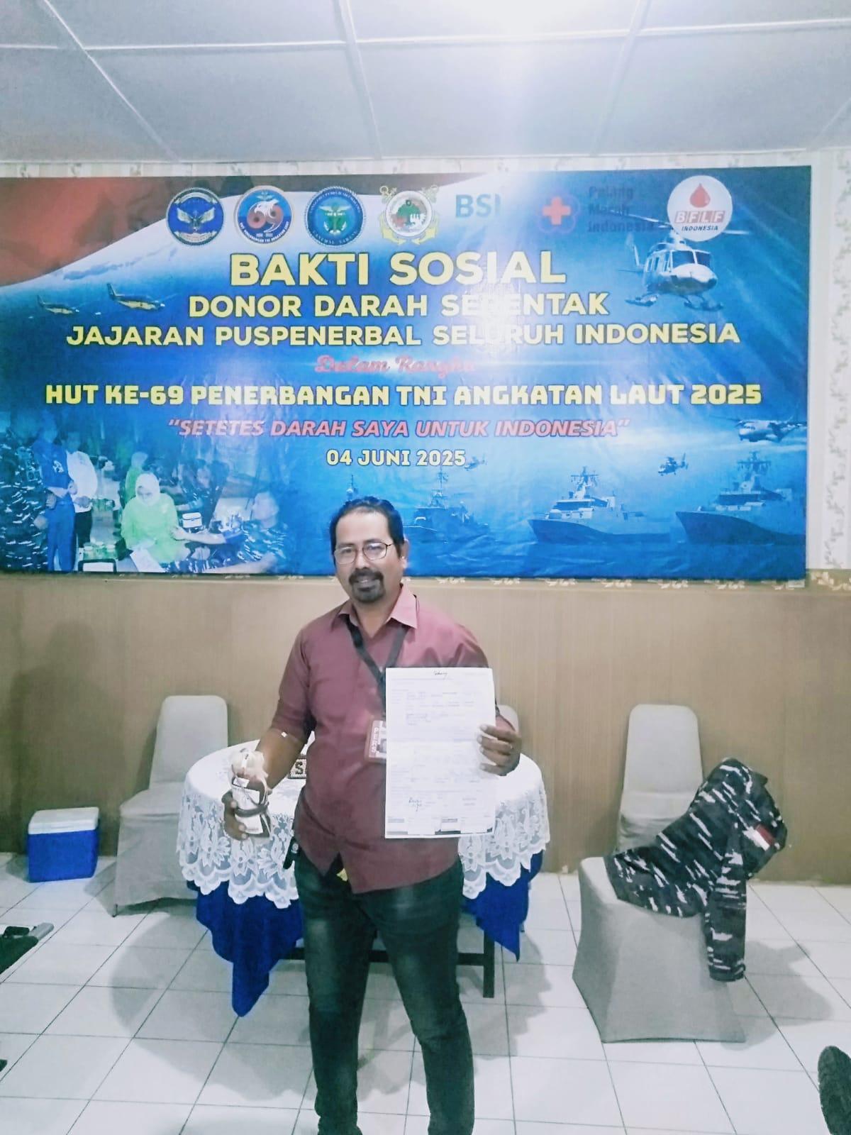 Sabang, 4 Juni 2025 — Dalam rangka memperingati Hari Ulang Tahun (HUT) ke-69 Penerbangan TNI Angkatan Laut (Puspenerbal), Markas Lanudal Kota Sabang menggelar kegiatan bakti sosial donor darah, Rabu (4/6). Salah satu tokoh yang hadir dan ikut mendonorkan darah adalah Mj Eric Novi Karno, Kepala Biro Media Mei Sabang.