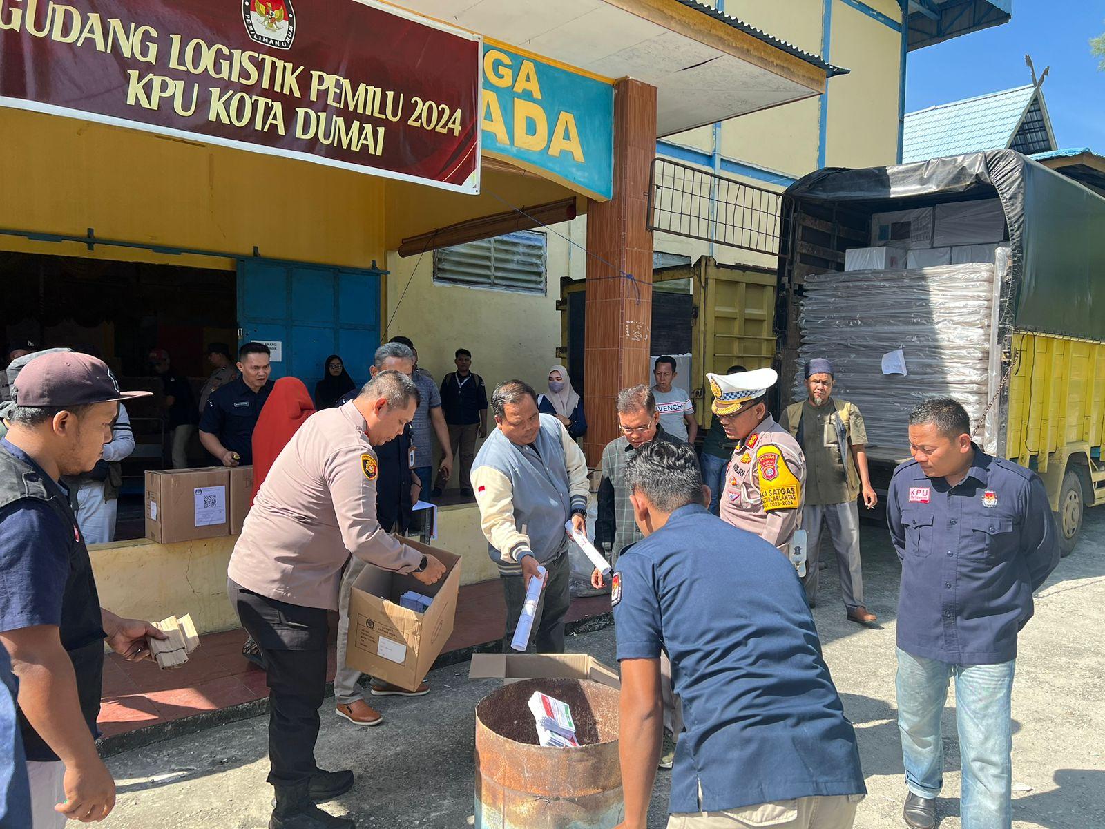 Mataelangindonesia.com – Dumai, Kapolres Dumai AKBP Dhovan Oktavianton, S.H, S.I.K, M.Si bersama Wadir Lantas Polda Riau AKBP Nurhadi Ismanto, S.H, S.I.K selaku Perwira Pengamat Wilayah (Pamatwil) Polda Riau Wilayah Kota Dumai menghadiri kegiatan pemusnahan kelebihan surat suara Pemilu 2024 yang dilakukan oleh Komisi Pemilihan Umum (KPU) Kota Dumai, Selasa (13/2/2024).