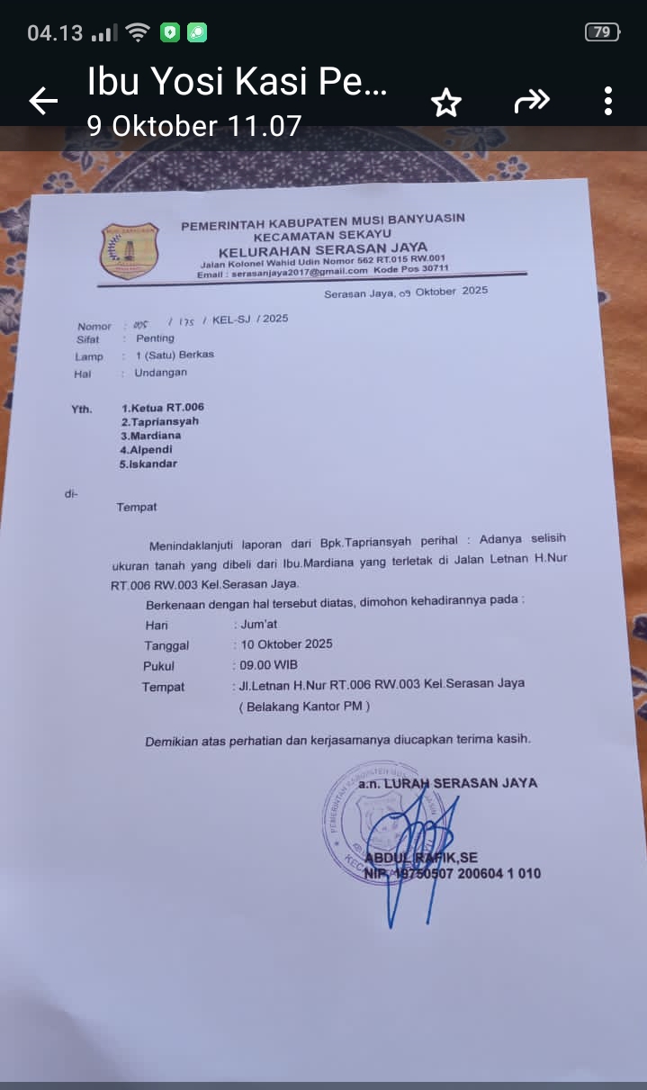 Pada Jumat (10/10/2025) sekitar pukul 10.00 WIB, pihak ahli waris yang diwakili oleh Iskandar bin H. Abubakar memenuhi undangan dari Lurah Serasan Jaya, Periyanto, SE., M.Si., terkait adanya selisih ukuran tanah dalam transaksi jual beli antara Mardiana (penjual) dan Tafriansyah (pembeli).