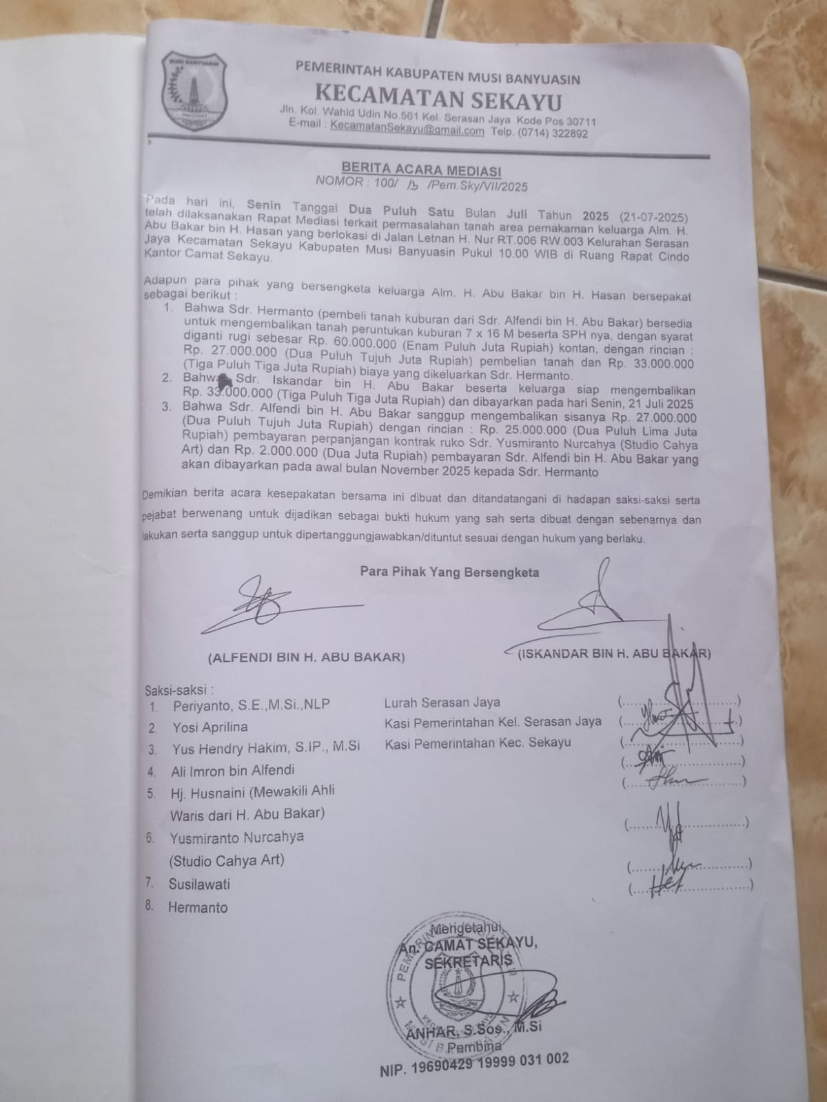 Padahal, sebelumnya permasalahan batas tanah ini telah diselesaikan melalui berita acara kesepakatan pada 21 Juli 2025, yang ditandatangani oleh pihak bersengketa, yakni Alpendi bin H. Abubakar dan Iskandar bin H. Abubakar, serta disaksikan oleh Lurah Serasan Jaya, Kasie Pemerintahan Yosi Aprilina, dan Sekretaris Camat Sekayu, Anhar, S.Sos., M.Si.